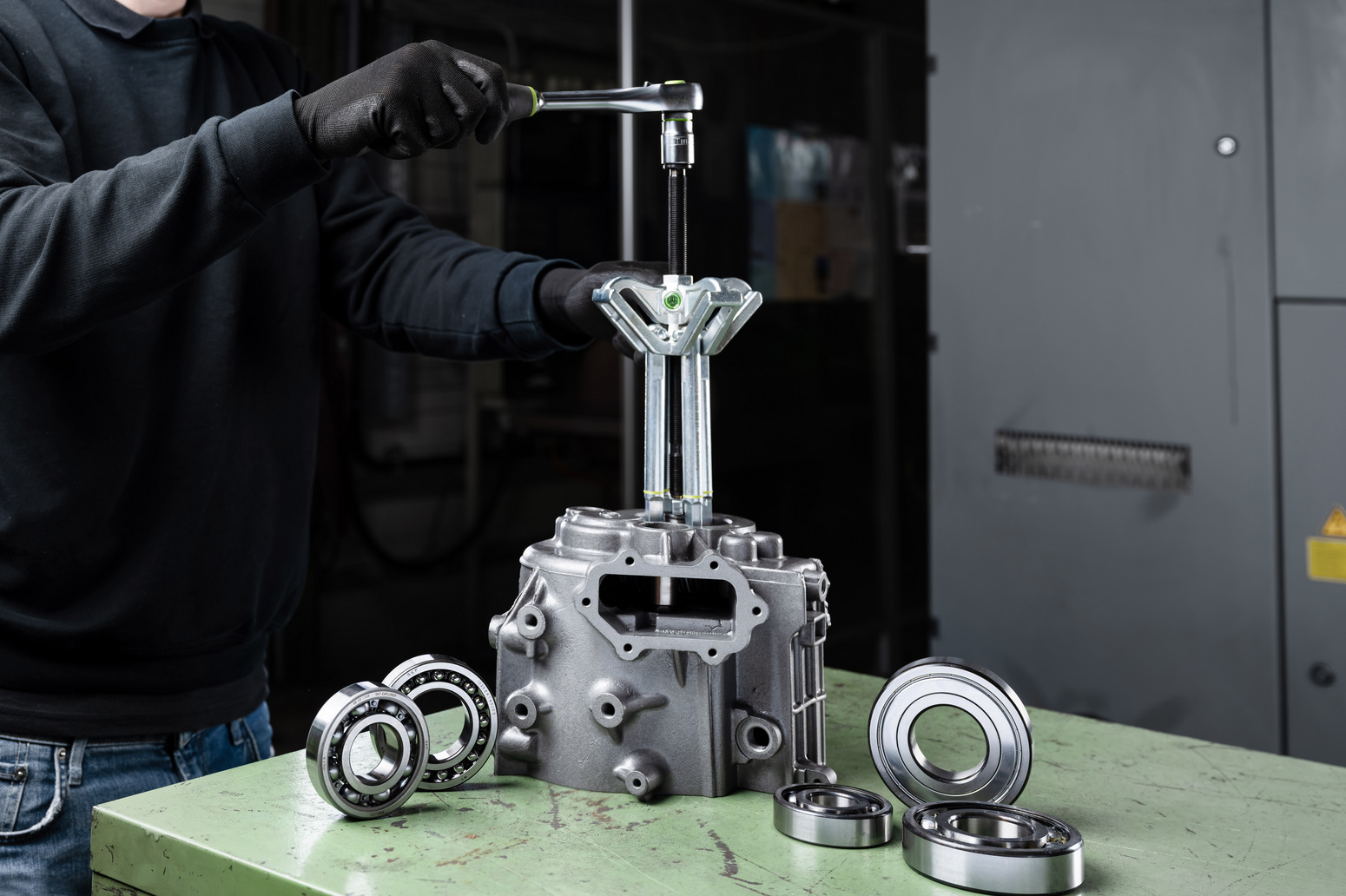L'estrattore per cuscinetti a sfere a gola profonda "PULLPO" della serie 70 viene utilizzato per estrarre i cuscinetti a sfere senza danneggiarli e senza rimuovere l'albero, in ambito artigianale, industriale e nelle officine. Anche senza possibilità di supporto, il PULLPO può estrarre in sicurezza cuscinetti altrimenti irraggiungibili, garantendo così il riutilizzo delle parti interessate. Il PULLPO convince non solo per la sua costruzione innovativa, ma anche per la sua facilità d'uso. I ganci di estrazione appositamente sviluppati permettono una presa affidabile durante l'estrazione e forze di smontaggio più elevate.
